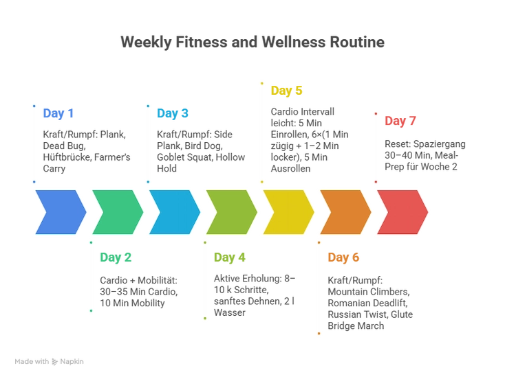 • 3–5 Workouts/Woche (2–3× Kraft/Rumpf, 2–3× Cardio, 1× HIIT optional)
